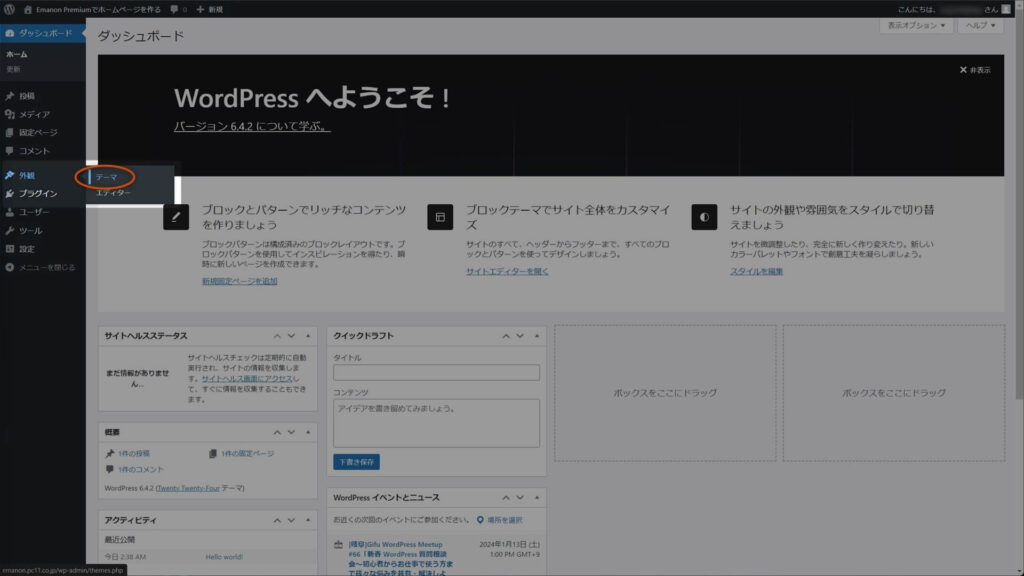 ダッシュボードの左メニューから外観→テーマをクリックします。