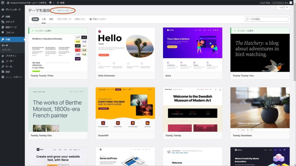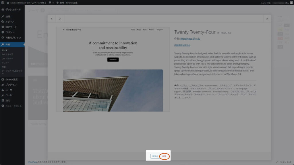 Emanon Premiumをインストールできたので、デフォルトでインストールされている不要なテーマを削除します。削除しなくても問題はありませんが、テーマのアップデートの通知など邪魔なことが多いし、残しておくメリットもないので消しておきましょう。