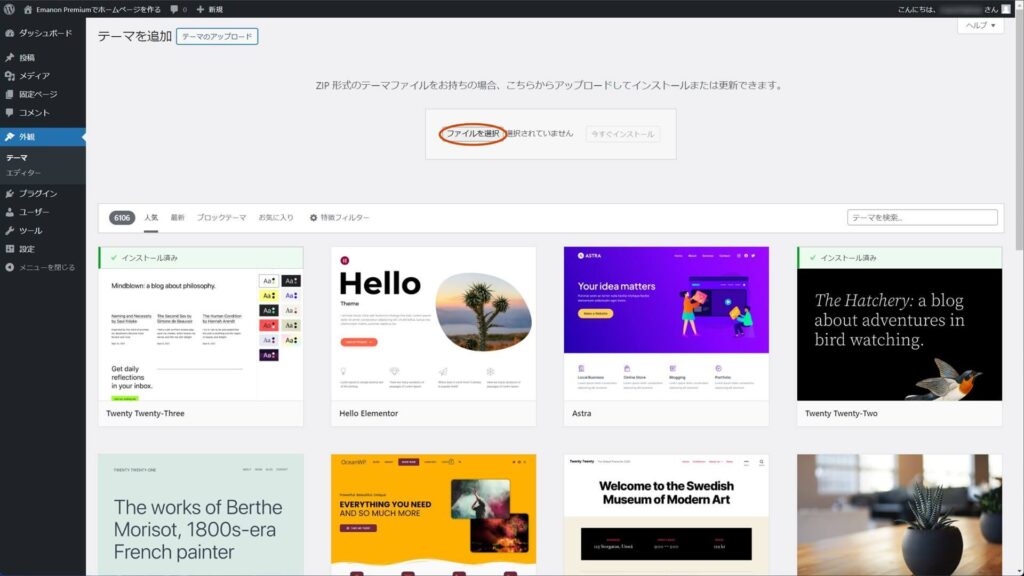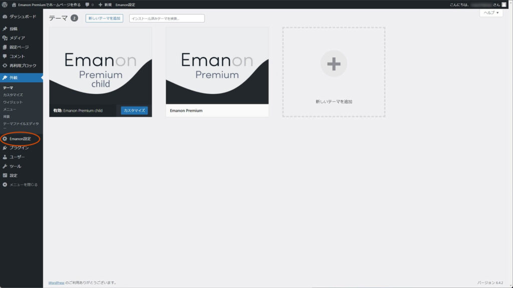 style.cssやfunction.phpなど高度なカスタマイズをする場合は、同様の手順で子テーマ(Emanon Premium Child)をインストールし、子テーマを有効化してください。