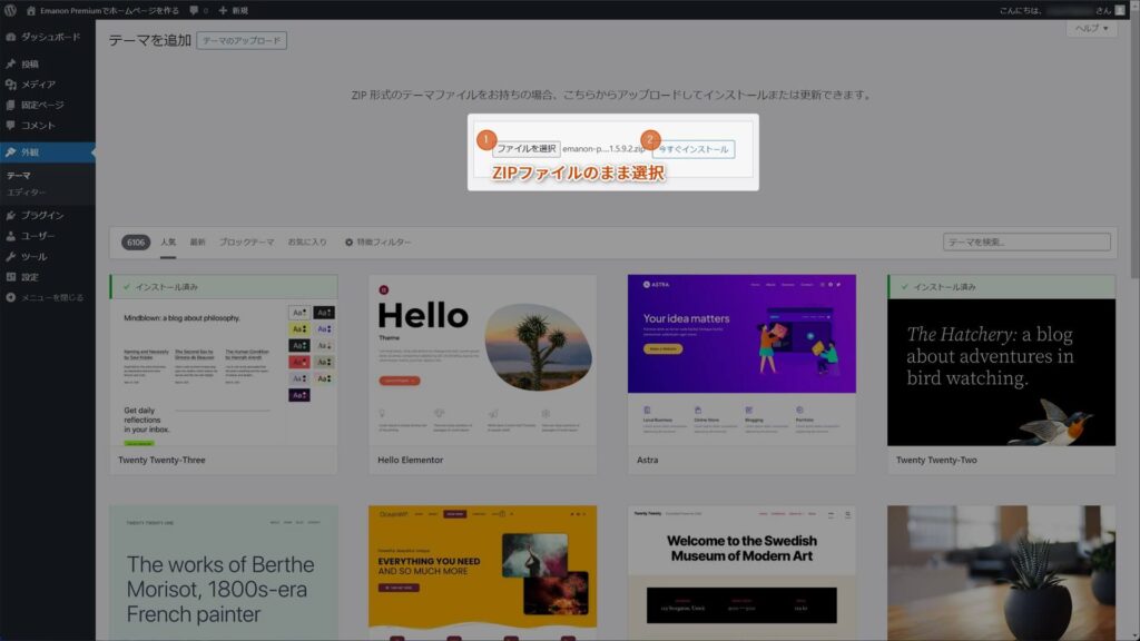 購入したテーマファイルは解凍せずにZIPファイルを選択してください。