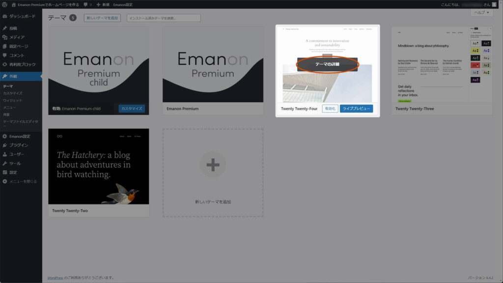 Emanon Premium、Emanon Premium Child以外のテーマにマウスカーソルを乗せテーマの詳細をクリックします。