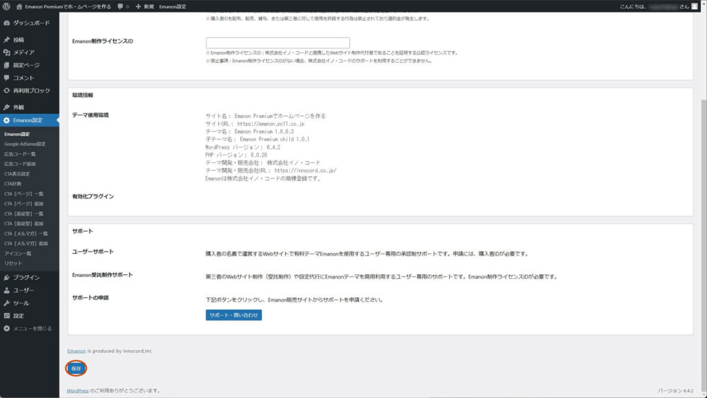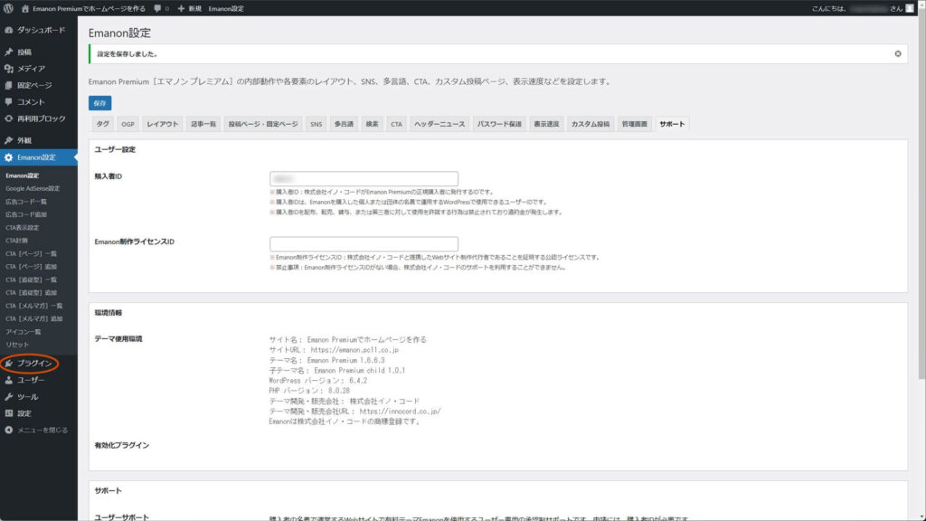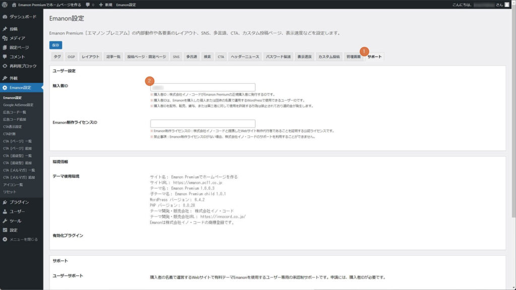 - ダッシュボードのEmanon設定→サポートのタブを開きます。