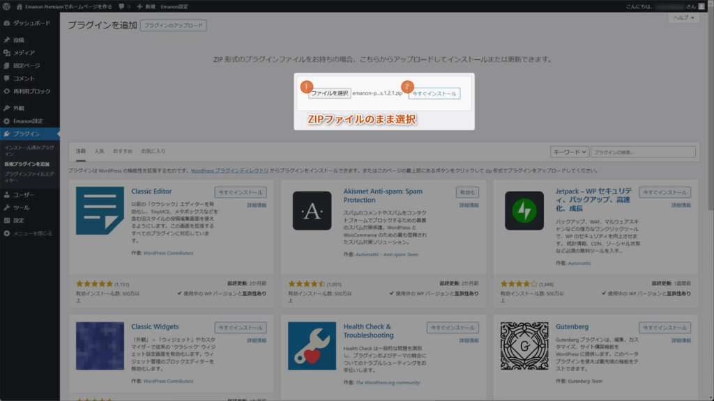プラグインファイルは解凍せずにZIPファイルを選択してください。